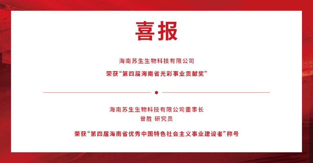 热烈祝贺海南苏生生物科技有限公司及董事长曾胜研究员,在“第四届海南省非公有制经济人士优秀中国特色社会主义事业建设者暨光彩事业贡献奖”评选表彰活动中,分别荣获“海南省光彩事业贡献奖”和“海南省优秀中国特色社会主义事业建设者”称号!