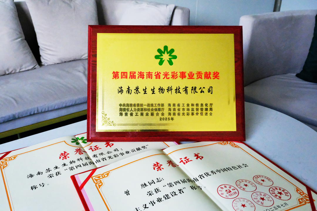 海南苏生生物科技有限公司凭借在积极践行社会责任、推动企业高质量发展方面的突出表现,被光荣授予 “第四届海南省光彩事业贡献奖”。这份荣誉是对公司坚守“义利兼顾、以义为先”光彩精神,以实际行动回馈社会的最高认可。