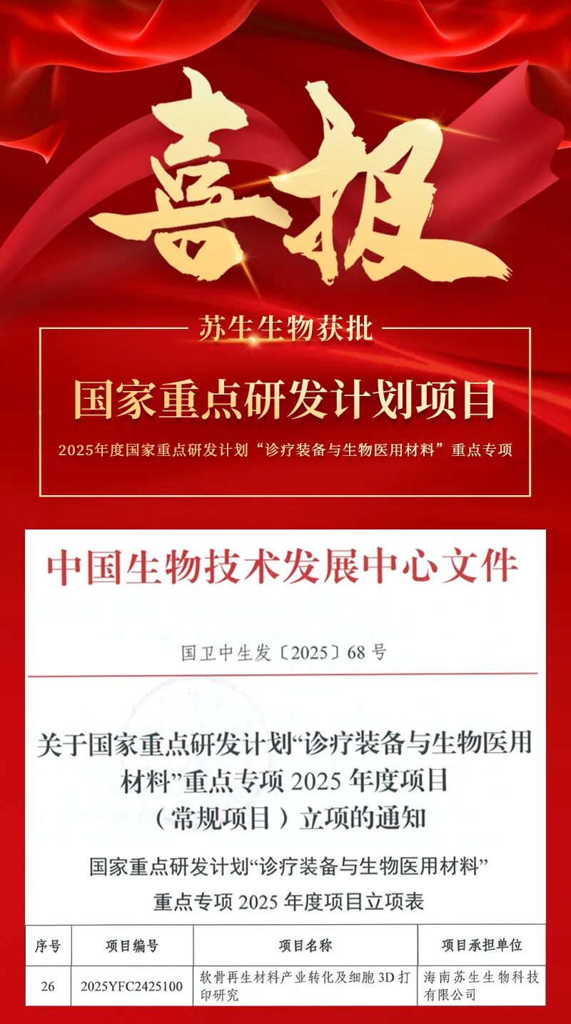 近日,科技部公布了2025年度国家重点研发计划“诊疗装备与生物医用材料”重点专项立项名单。由海南苏生生物科技有限公司(以下简称:苏生生物)承担的“软骨再生材料产业转化及细胞3D打印研究”项目(项目编号:2025YFC2425100)成功获批。曾胜研究员任项目负责人。