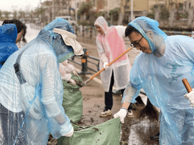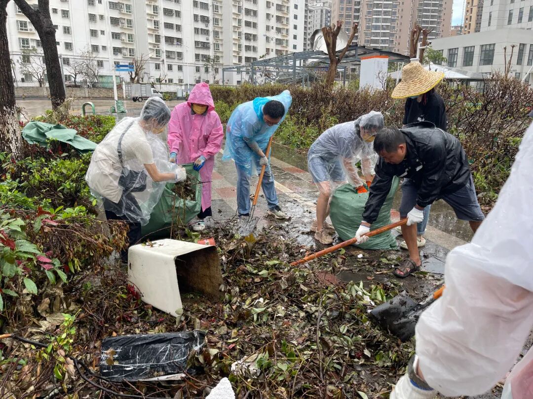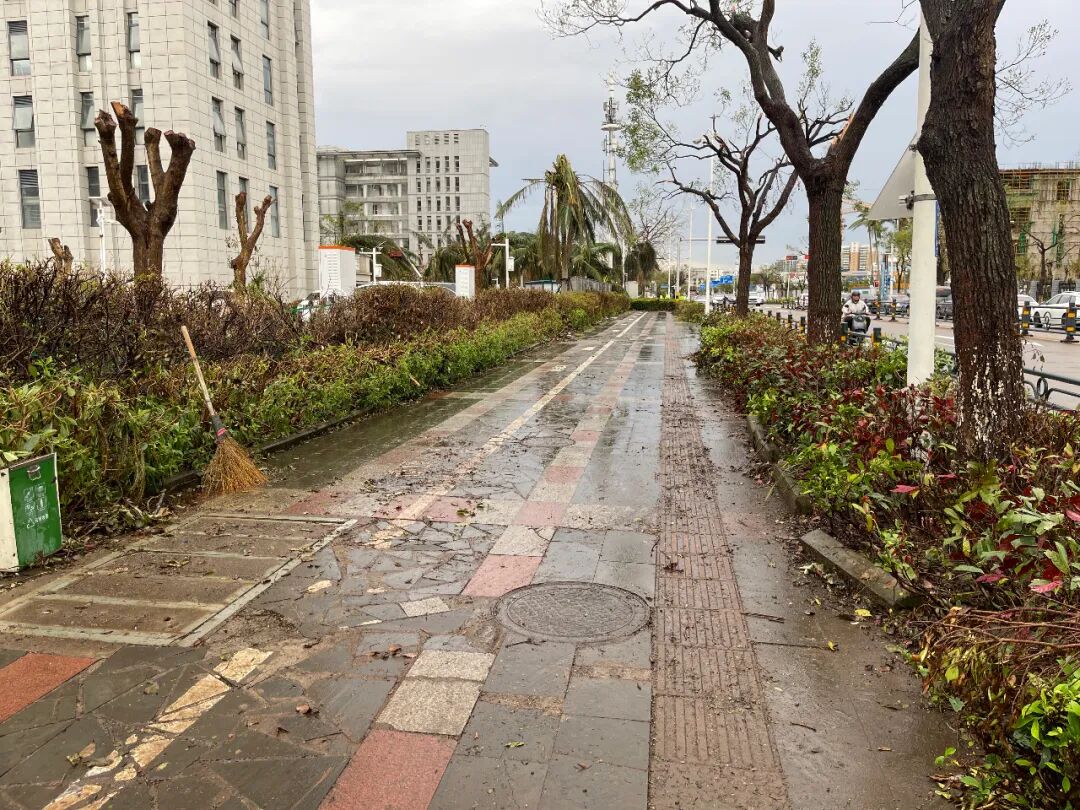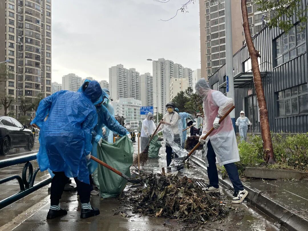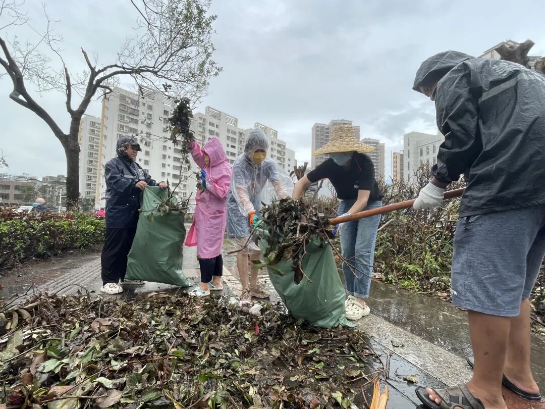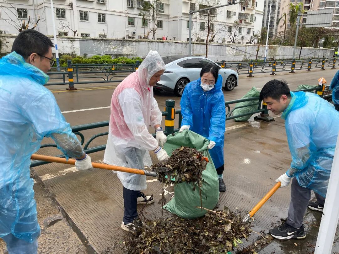 苏生生物党员干部们在海口美祥路、美祥北路、美苑路等道路有序开展道路清障、垃圾清理清运工作,在确保安全的情况下对现场树枝、铁皮、玻璃碎片等障碍物进行全面清理。