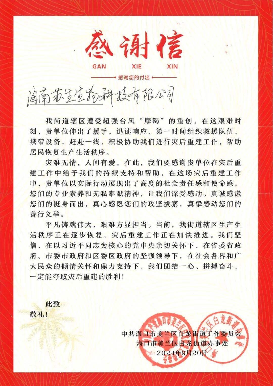 10月16日,苏生生物党支部收到了中共海口市美兰区百龙街道工作委员会和海口市美兰区白龙街道办事处颁发的感谢信。
